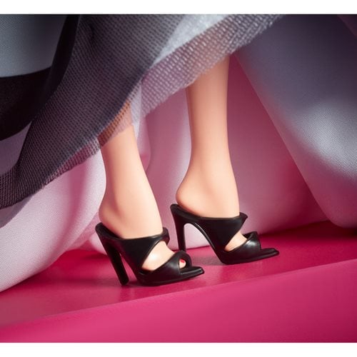 • She wears a black and white gown inspired by the swimsuit that the original Barbie doll wore. A fitted sweetheart bodice blooms into a voluminous striped skirt.