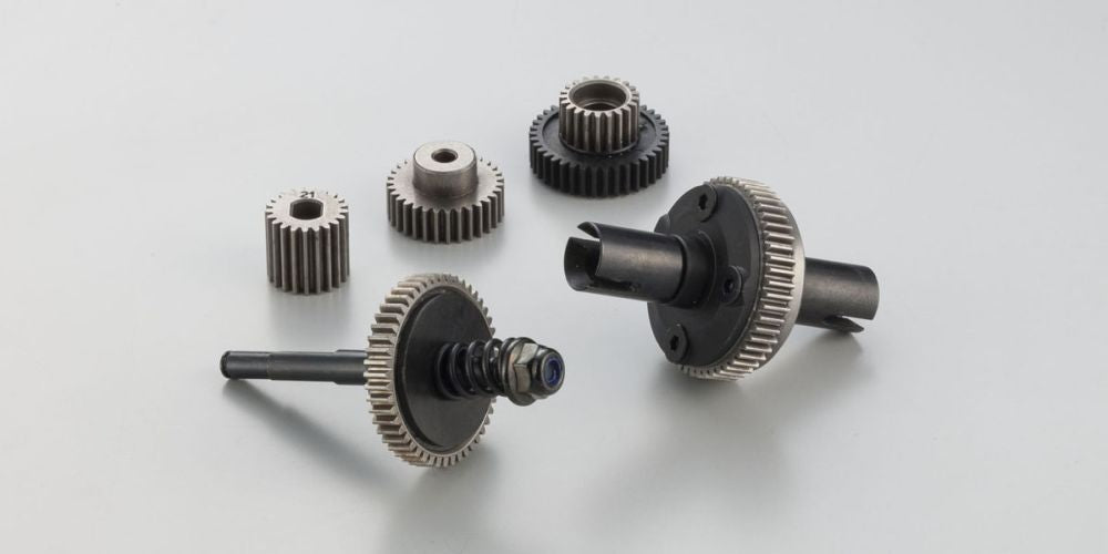 Two-piece diecast aluminum gearbox with built-in diff gears.