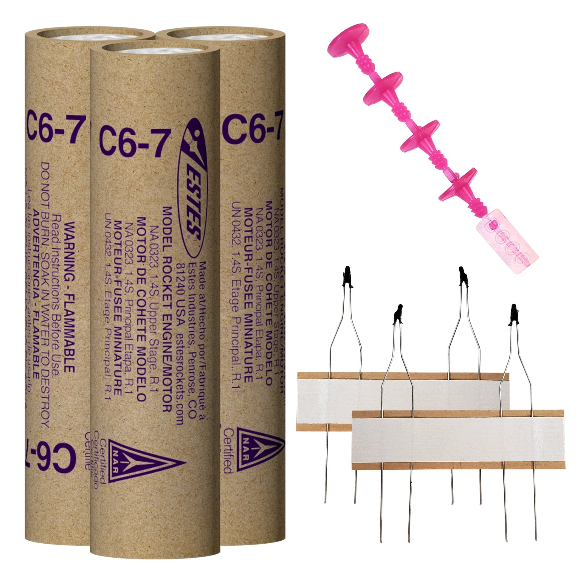 Each C6-7 engine pack includes three engines, four starters, and four starter plugs, ensuring you have everything needed for multiple launches. Estes engines are engineered for reliability and precision, giving rocketeers the confidence to launch with consistent ignition and predictable flight performance. The parachute ejection charge activates at the perfect moment to ensure a safe and stable landing, allowing for easy rocket retrieval and quick reusability.