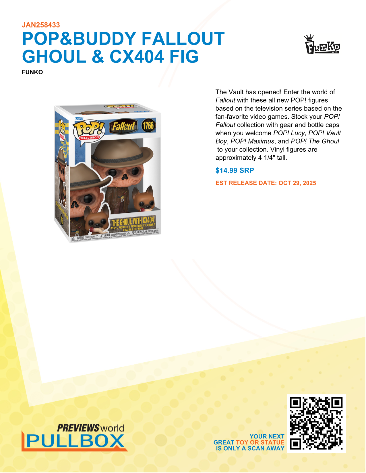 The Vault has opened! Enter the world of Fallout with these all new POP! figures based on the television series based on the fan-favorite video games. Stock your POP! Fallout collection with gear and bottle caps when you welcome POP! Lucy, POP! Vault Boy, POP! Maximus, and POP! The Ghoul with CX404 to your collection. Vinyl figures are approximately 4 1/4" tall.