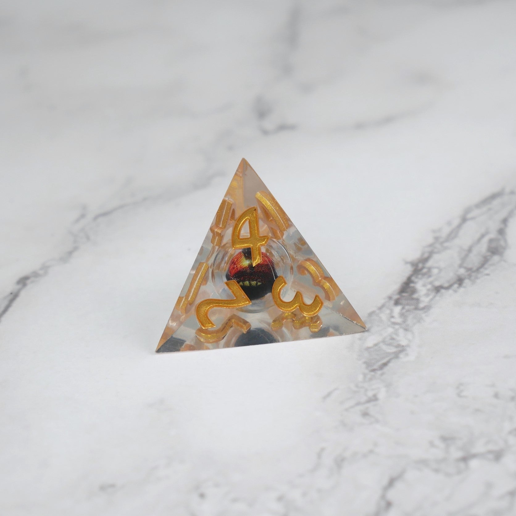 Clear, sharp edge dice with floating, moving orange eyeball.