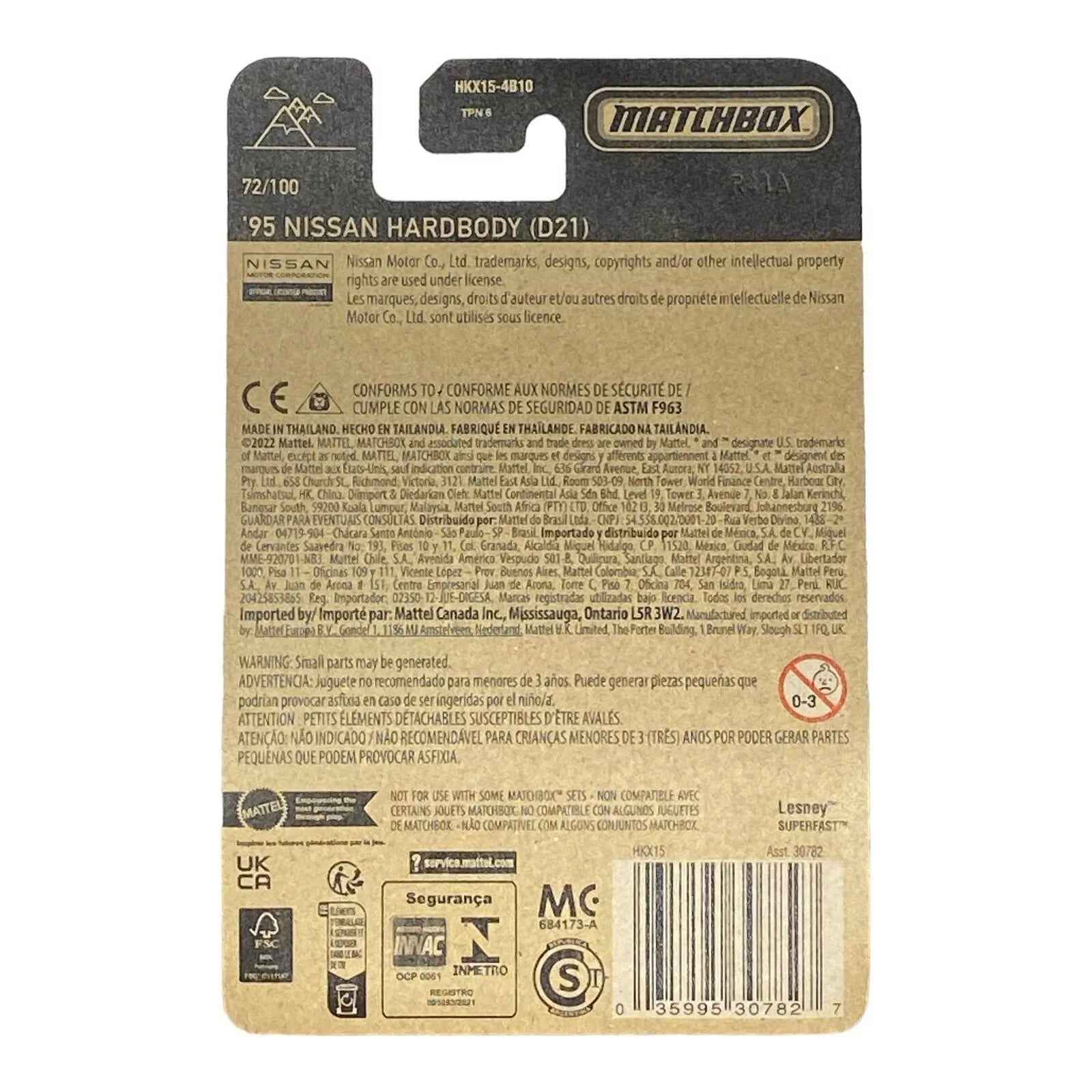 Introducing the Matchbox '95 Nissan Hardbody (D21) from the Matchbox 70 Years Series 72/100. This stunning replica encapsulates the essence of the early '90s truck that was not just a vehicle but a symbol of ruggedness and reliability. With its unique design and attention to detail, the Matchbox '95 Nissan Hardbody (D21) appeals to collectors and automotive enthusiasts alike. The series celebrates 70 years of Matchbox excellence, making this particular model a must-have for your collection.
