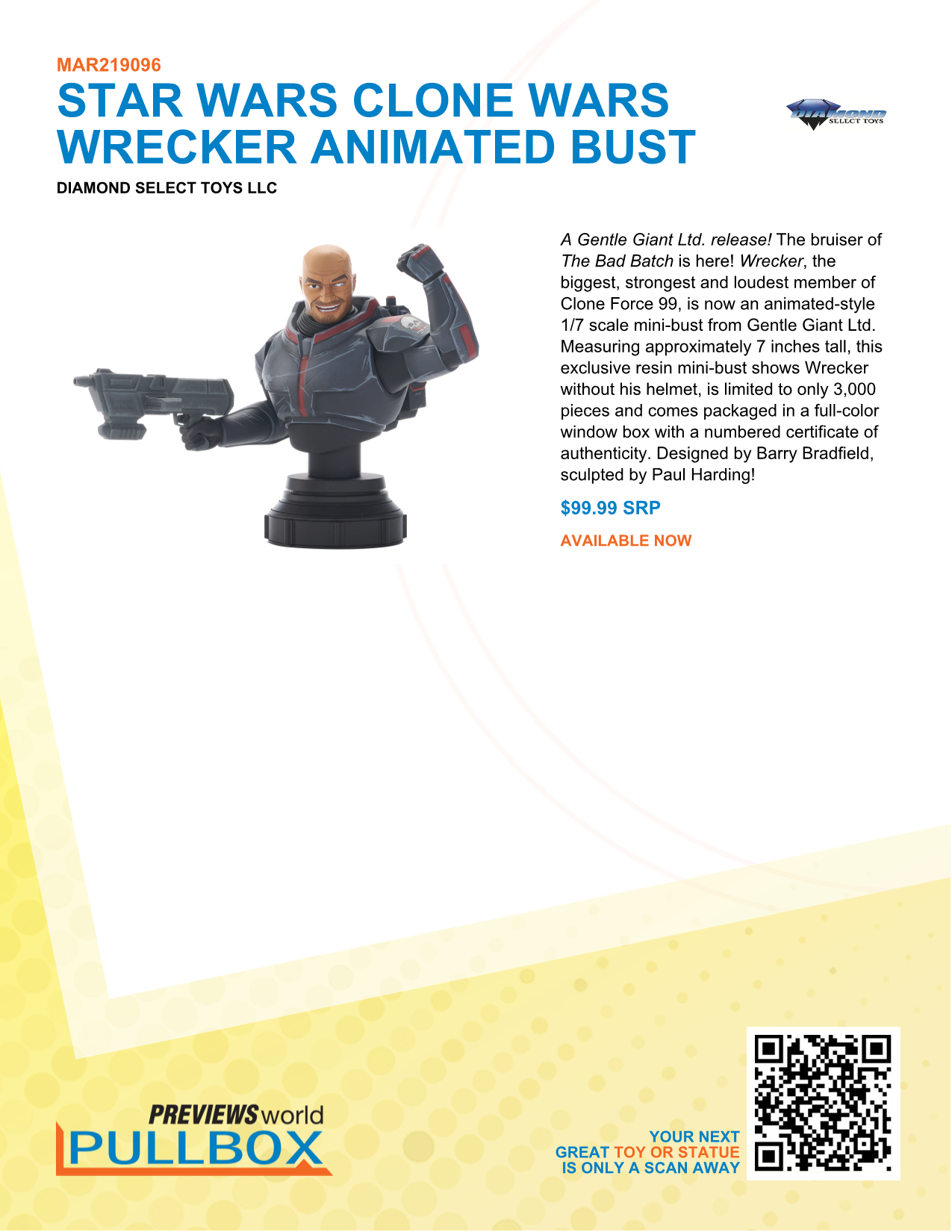 A Gentle Giant Ltd. release! The bruiser of The Bad Batch is here! Wrecker, the biggest, strongest and loudest member of Clone Force 99, is now an animated-style 1/7 scale mini-bust from Gentle Giant Ltd. Measuring approximately 7 inches tall, this exclusive resin mini-bust shows Wrecker without his helmet, is limited to only 3,000 pieces and comes packaged in a full-color window box with a numbered certificate of authenticity. Designed by Barry Bradfield, sculpted by Paul Harding!