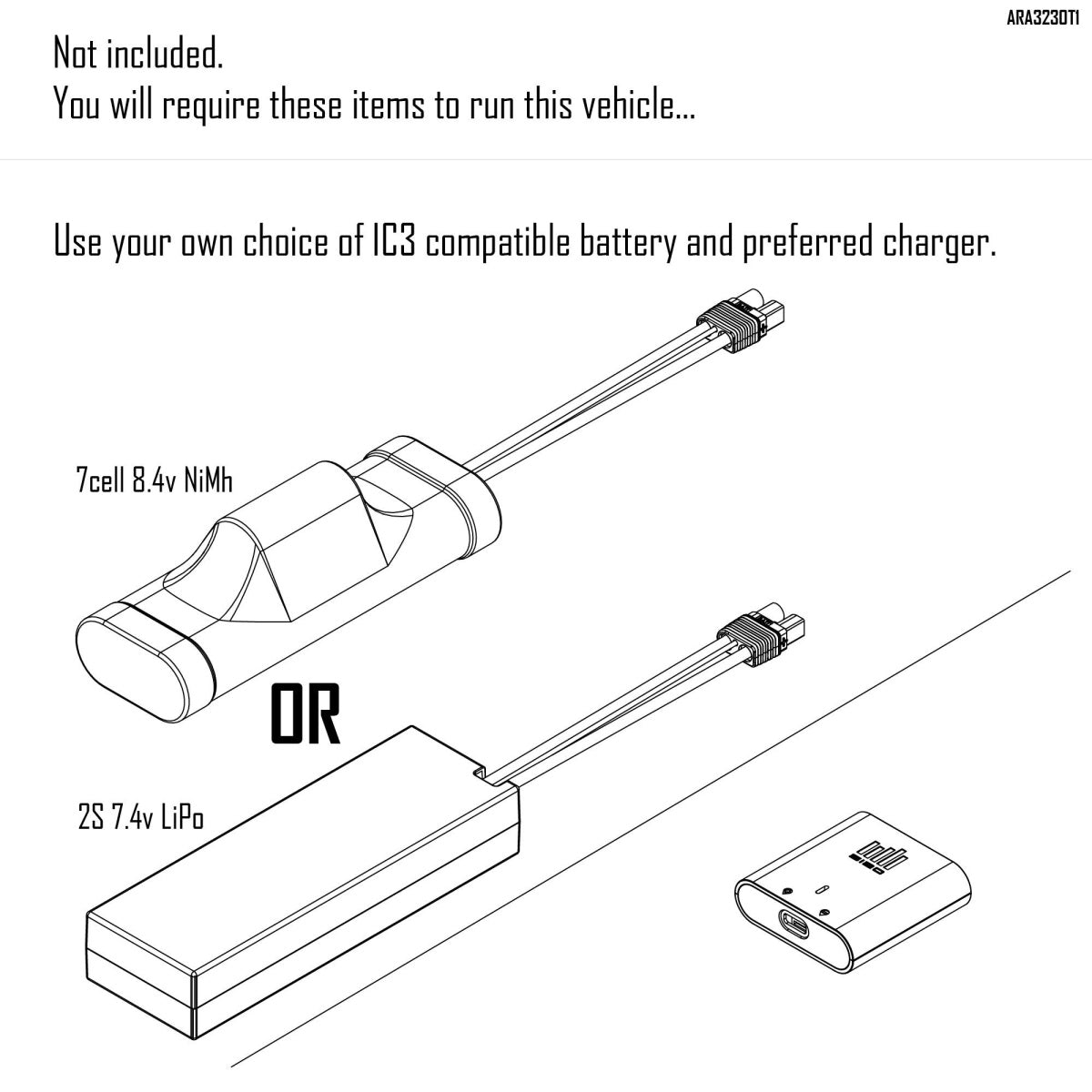 A 7-Cell NiMH or 2S LiPo battery with IC3/EC3 connectors