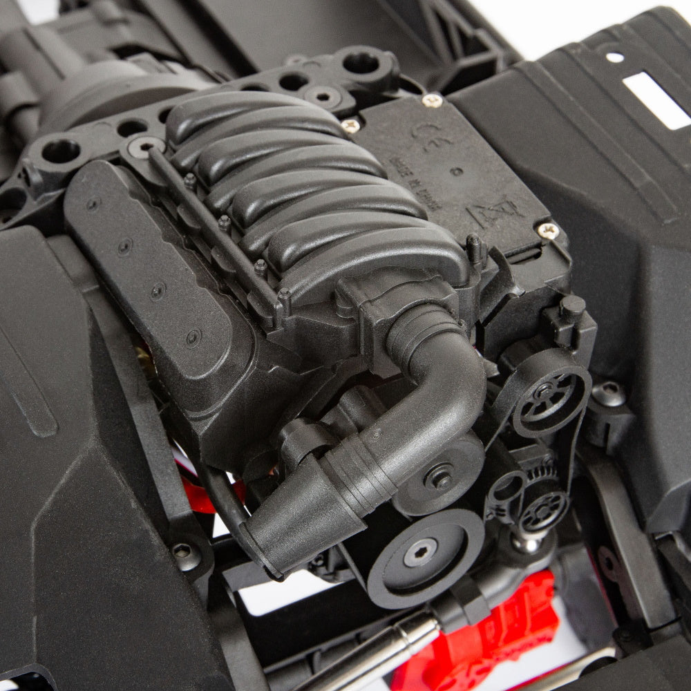 Replica V8 engine cover, transmission housing and transfer case cover and protect the motor while improving scale appearance and adding forward-mounted weight.