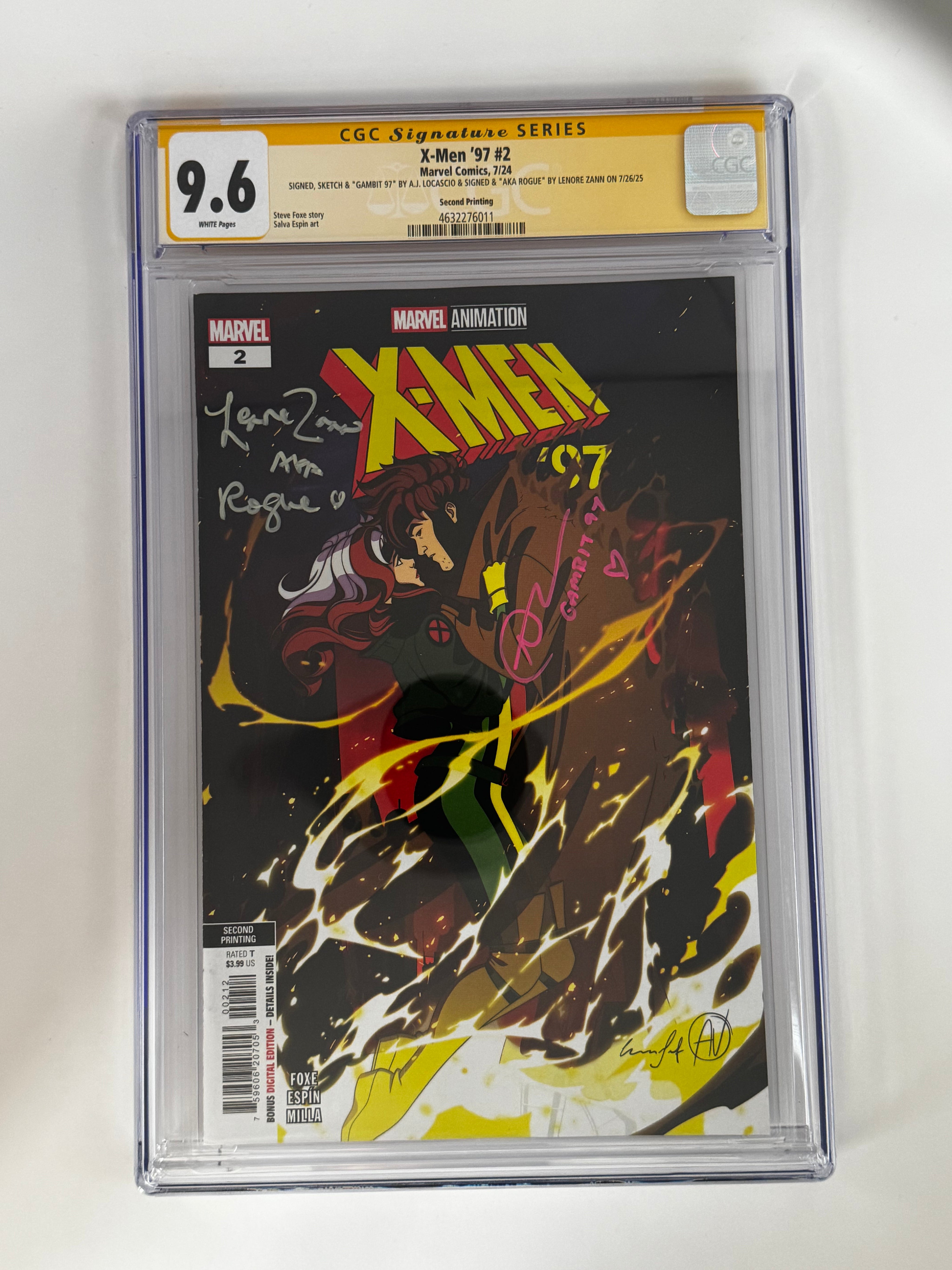 Catch this double-signed treasure! X-MEN '97 #2 CGC 9.6 Yellow Label 2nd Printing Steve Espin Variant signed by Lenore Zann, the voice of Rogue, and AJ LoCascio, the voice of Gambit. A perfect duo to electrify your collection with iconic X-Men voices and exclusive artwork. Ready to add some mutant charisma to your shelf?