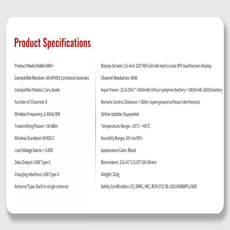 NB4+ supports the entire series of FlySky i-BUS2 devices, as well as Hobbywing (XeRun Axe R2 Esc) and Power HD (GTS-3, GTS-5, GTS-6, GTS-7). It supports remote parameter adjustment at the transmitter end, with multiple parameteres adjustable to meet various usage demands.