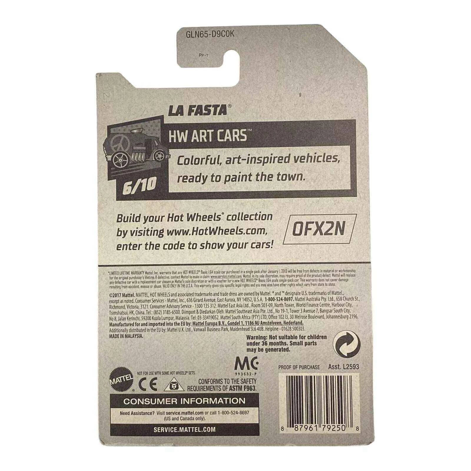 Crafted with precision, the Hot Wheels La Fasta not only serves as a collectible item but also as an artistic piece. With its stunning graphics, elaborate paint job, and aerodynamic design, this model exudes charisma and style. It's perfect for display or adding to a dynamic track setup. Whether you're a hardcore collector or just starting, La Fasta is an extraordinary choice.