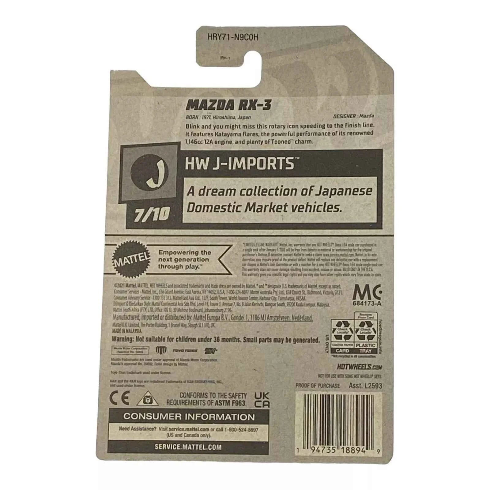 The Hot Wheels Mazda RX-3 is a standout model within the J-Imports Series, celebrated for its rich history and iconic design. This model captures the essence of the original RX-3, a vehicle that made a significant impact on the automotive industry. With its stunning looks and superior performance, it's no wonder that collectors and enthusiasts alike are keen to add this piece to their collections.