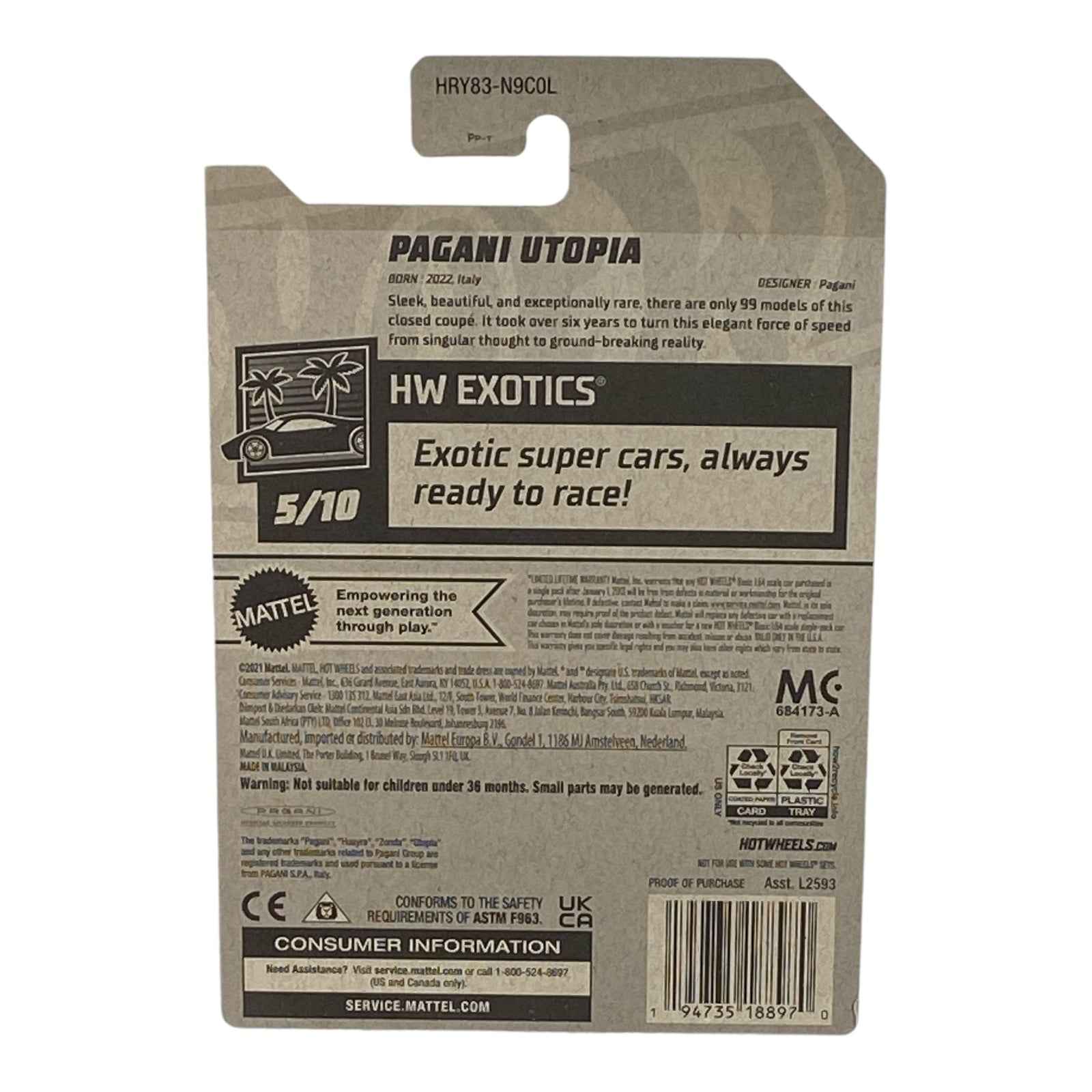 The Hot Wheels Pagani Utopia is a stunning model that embodies the pinnacle of automotive engineering and design. This exquisite die-cast car is not just a toy; it's a piece of art that any enthusiast will cherish. The Pagani Utopia, part of the Exotics Series 5/10, showcases exquisite attention to detail, a striking color palette, and unmatched performance features that will captivate collectors and fans alike.