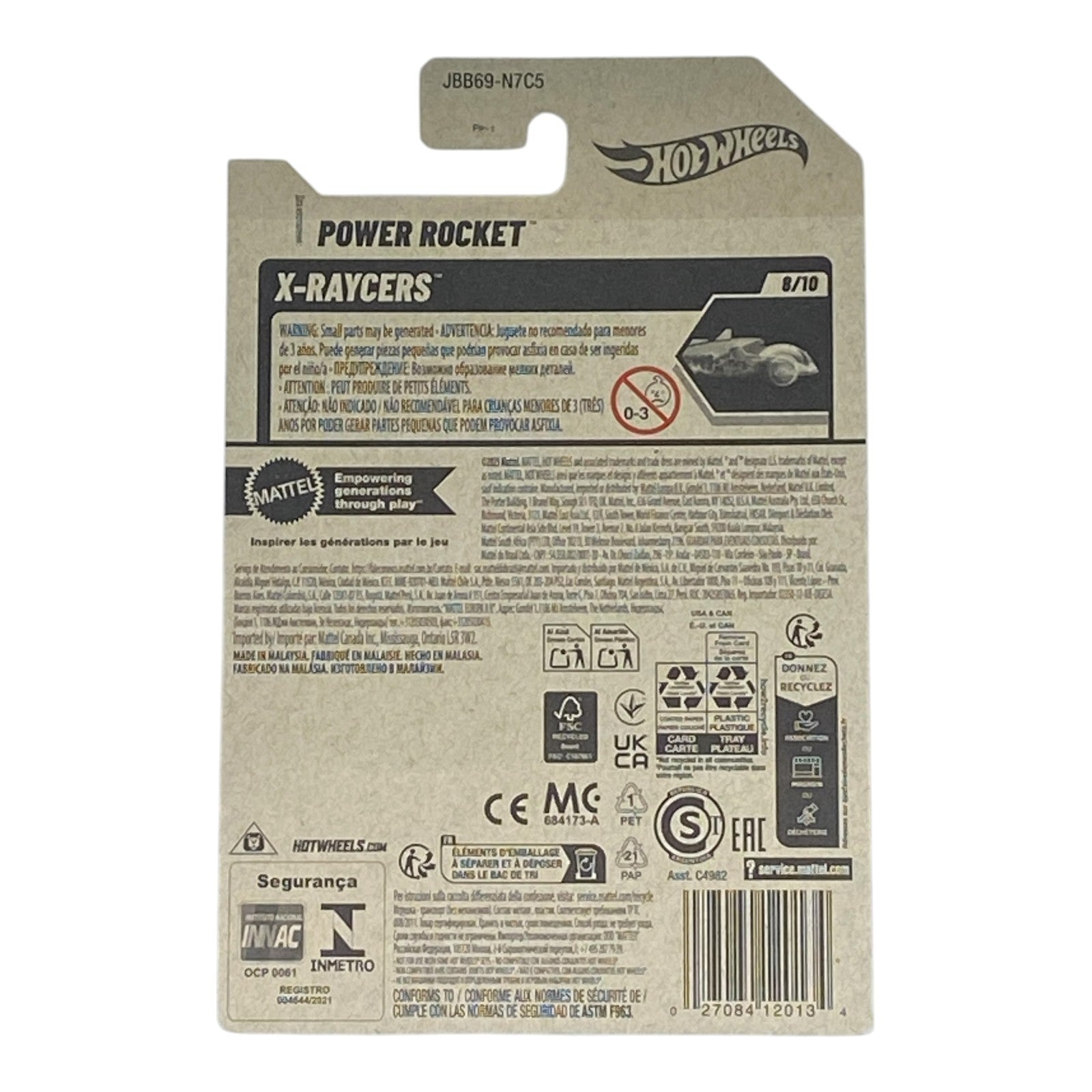 Blast off into supersonic adventures with the Hot Wheels Power Rocket from the X-Raycers Series 8/10! This 2025 mainline stunner (#109/250, HYY53) is a 1:64 scale die-cast fantasy rocket car, crafted by Hot Wheels legend Larry Wood, featuring a translucent green body with white and orange tampo accents, a massive rear engine, fixed wings, and an aerodynamic canopy for otherworldly speed. Equipped with RA6 white wheels, orange metal base, green-tinted windows, and chrome interior, it channels jet-fueled propulsion perfect for conquering loops, launches, and straightaways on orange tracks. Ideal for kids 3+ and collectors, this translucent teal powerhouse delivers interactive play and display dazzle, tying into the Netflix Let's Race vibe. Search “Hot Wheels Power Rocket 2025 green” or “X-Raycers diecast rocket car” to fuel your garage with this must-have mini that rockets every race to hyperspace heights!