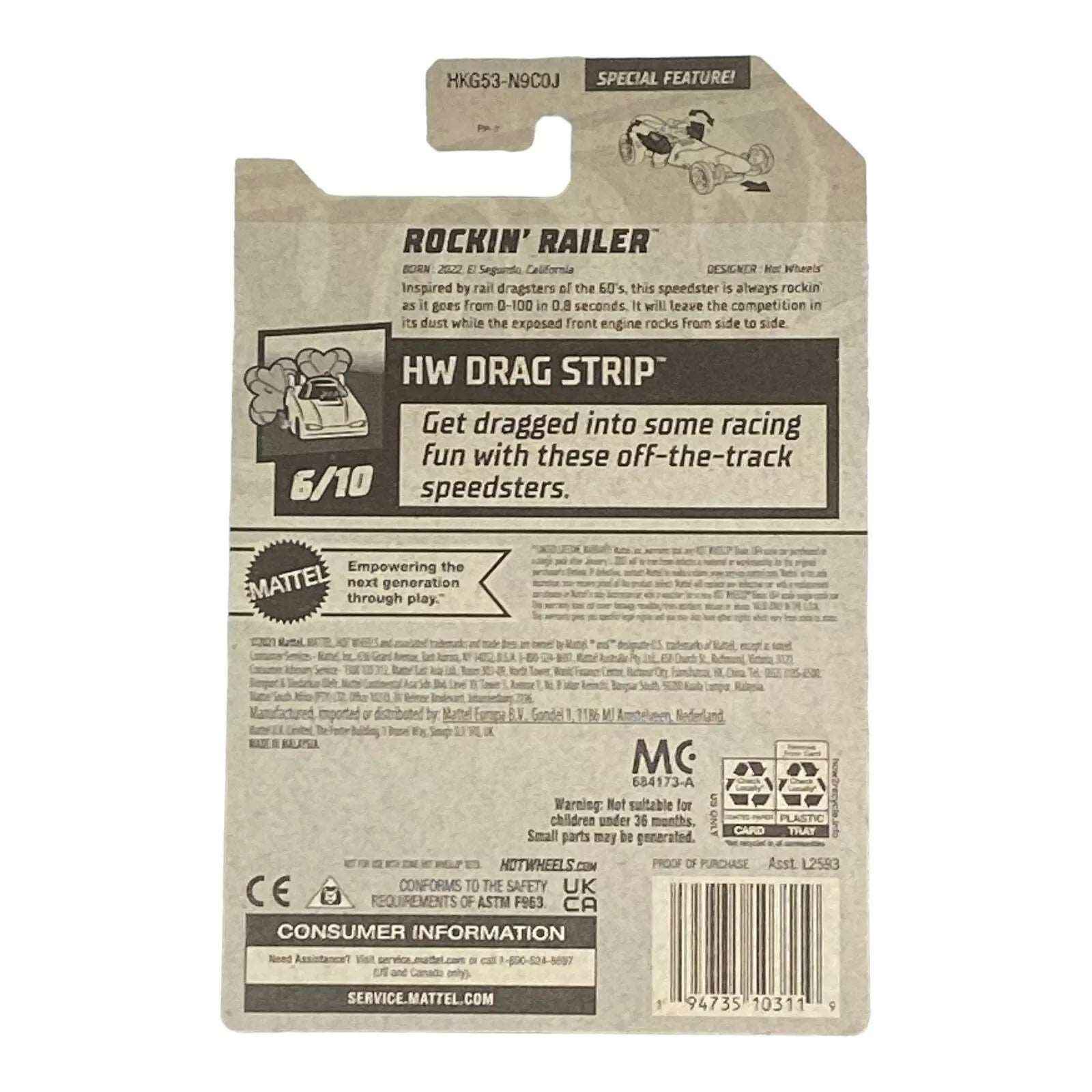 This car is an embodiment of creativity and imagination, offering unlimited opportunities for storytelling and adventure. Whether you’re setting up a mini drag strip or integrating it into an existing Hot Wheels collection, the Rockin' Railer enhances the excitement with its high-performance capabilities.