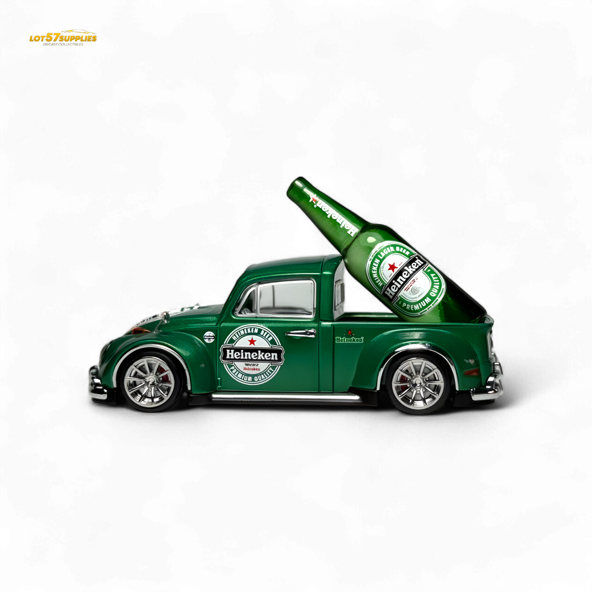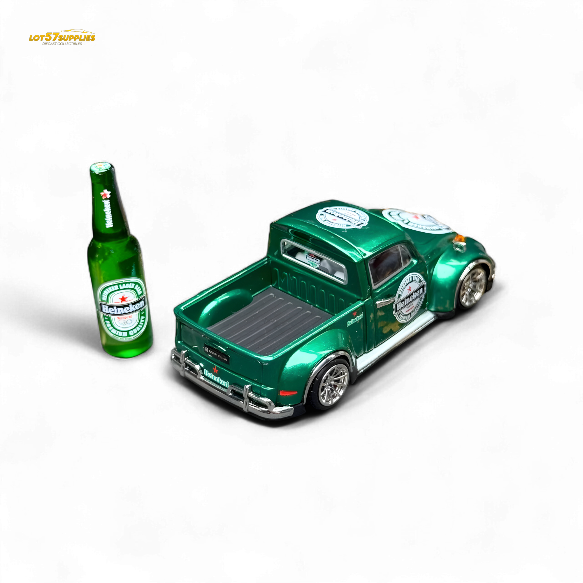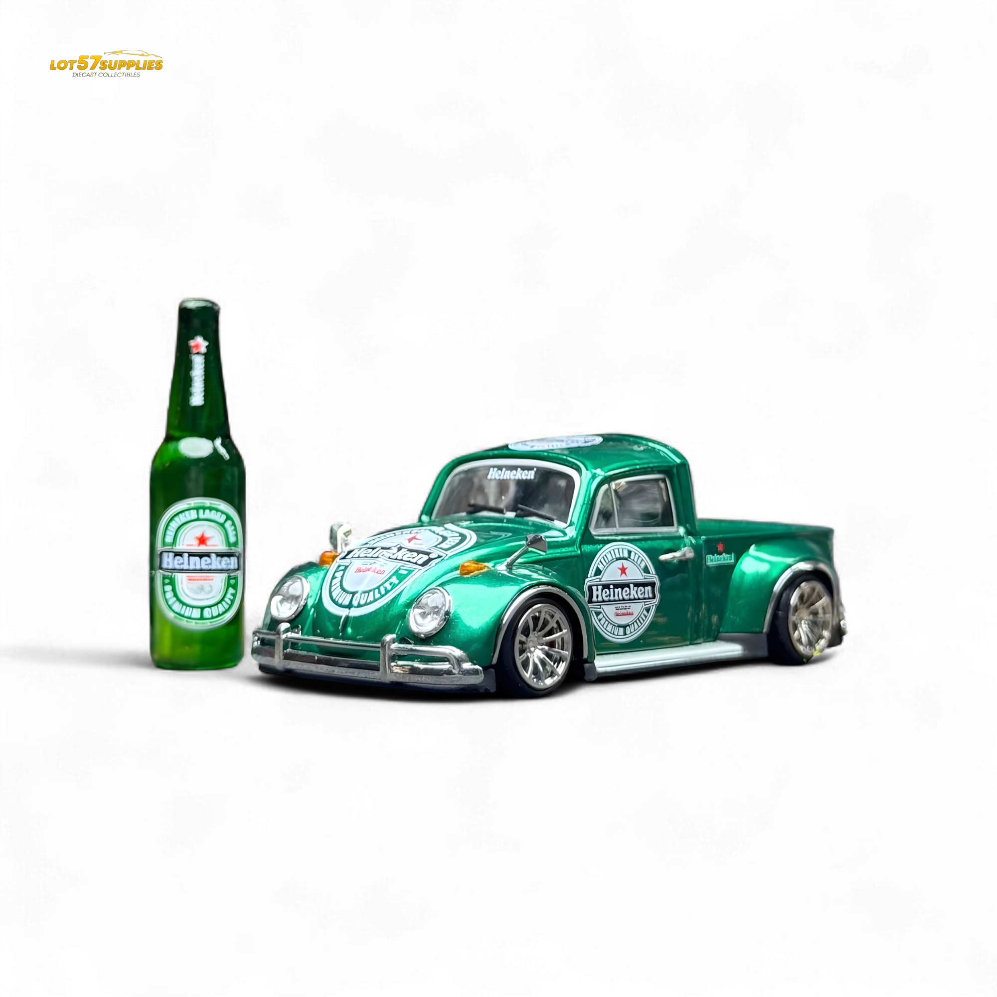 Pop the cap on this custom VW Beetle truck in vibrant Heineken green! This 1:64 scale casting comes slammed and styled with Heineken logos all over, perfectly matched with a realistic Heineken bottle prop for display. Silver deep-dish wheels and chrome bumpers finish off the vibe. This one’s for the diecast collectors who enjoy crisp details and chilled vibes.