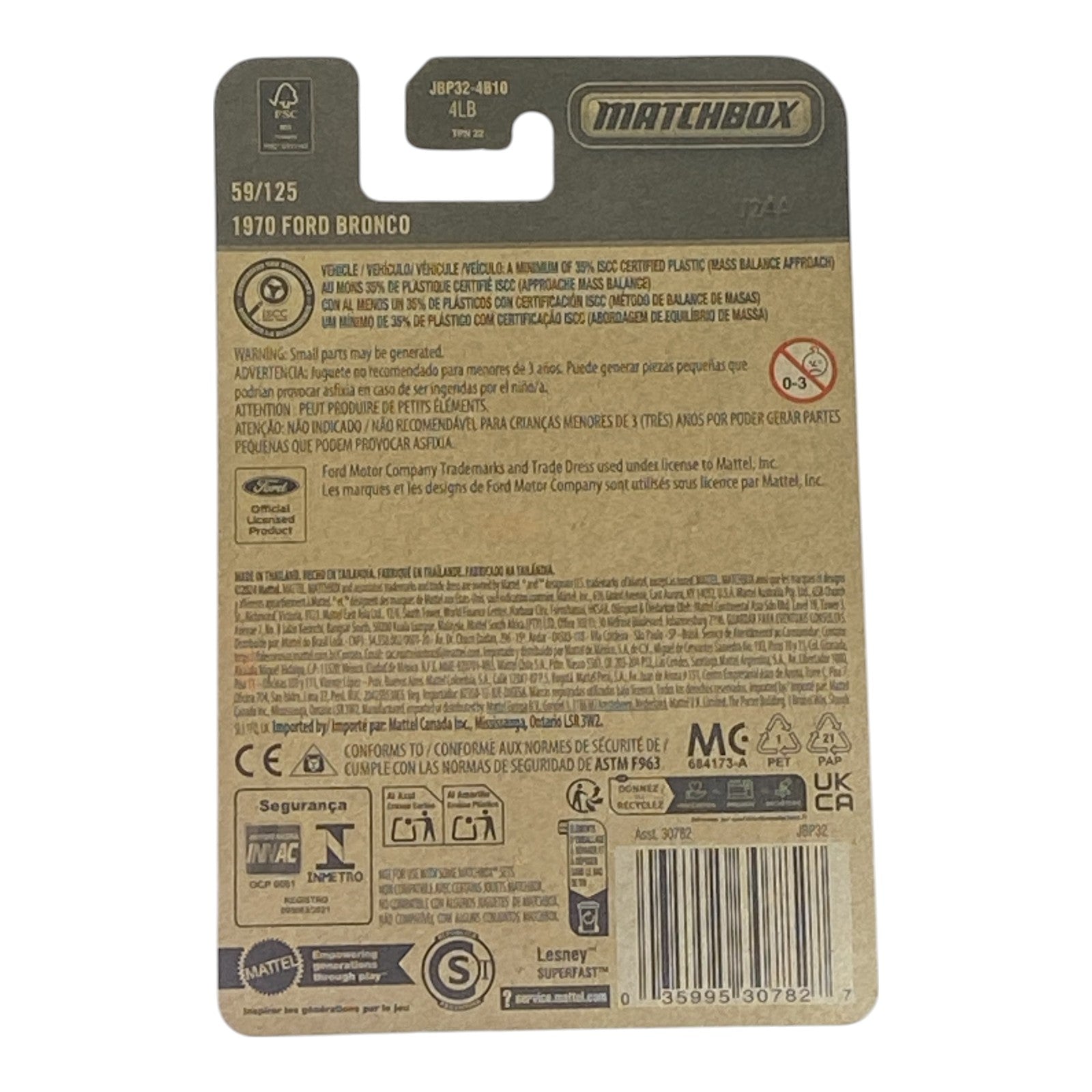 Discover the classic Matchbox 1970 Ford Bronco – a meticulously detailed 1:64 scale replica of the original first-generation off-road legend, released as #59/100 in the 2025 Matchbox mainline series (widely tracked as 59/125 by collectors). This rugged bright red variant captures the iconic early Bronco's boxy styling and trail-blazing spirit, making it a must-have for Ford enthusiasts and Matchbox collectors chasing premium 2025 vintage SUVs.