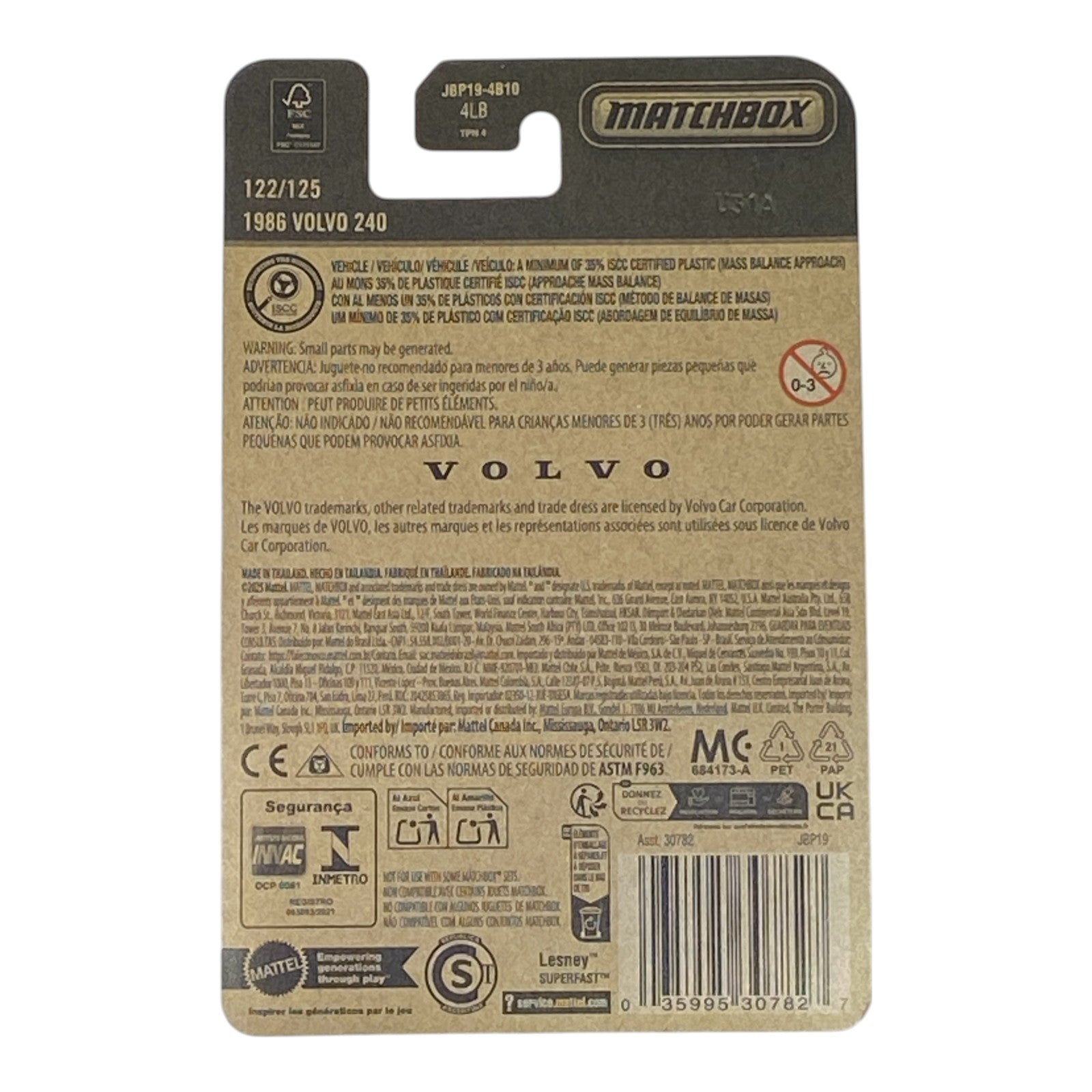 Discover the 2025 Matchbox 1986 Volvo 240 (#122/125) – a highly detailed 1:64 scale diecast replica of the iconic Swedish classic sedan, perfect for collectors and enthusiasts.
