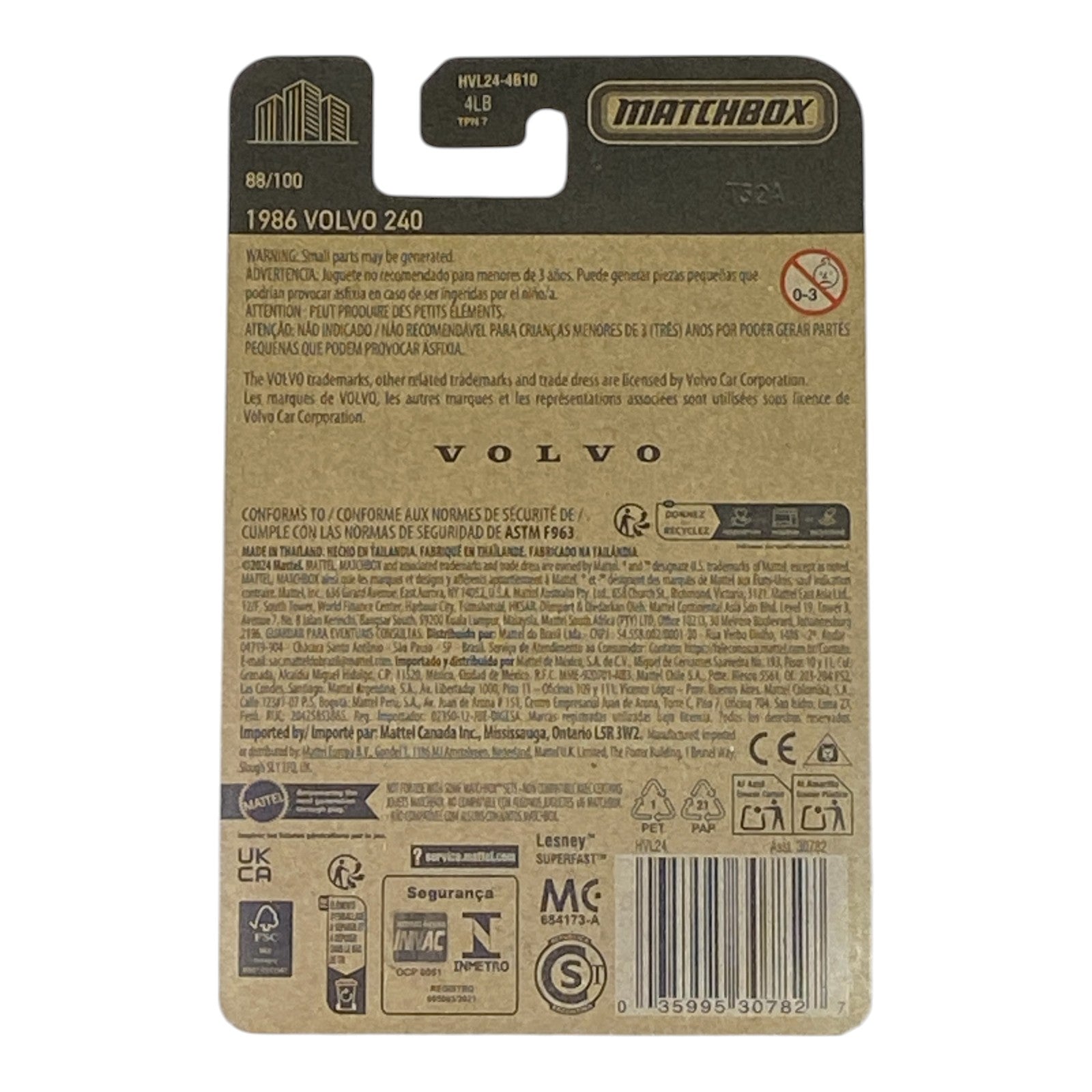 Rev up your collection with the striking red Matchbox 1986 Volvo 240 from the 2024-2025 Matchbox Series 88/100! This vibrant burgundy red (or garnet metallic) 1:64 scale die-cast perfectly captures the iconic Swedish "brick" wagon in its classic '80s glory, complete with authentic boxy lines, detailed tampo graphics, and legendary safety-inspired design. A standout for Volvo fans, Matchbox collectors, and lovers of retro European classics.