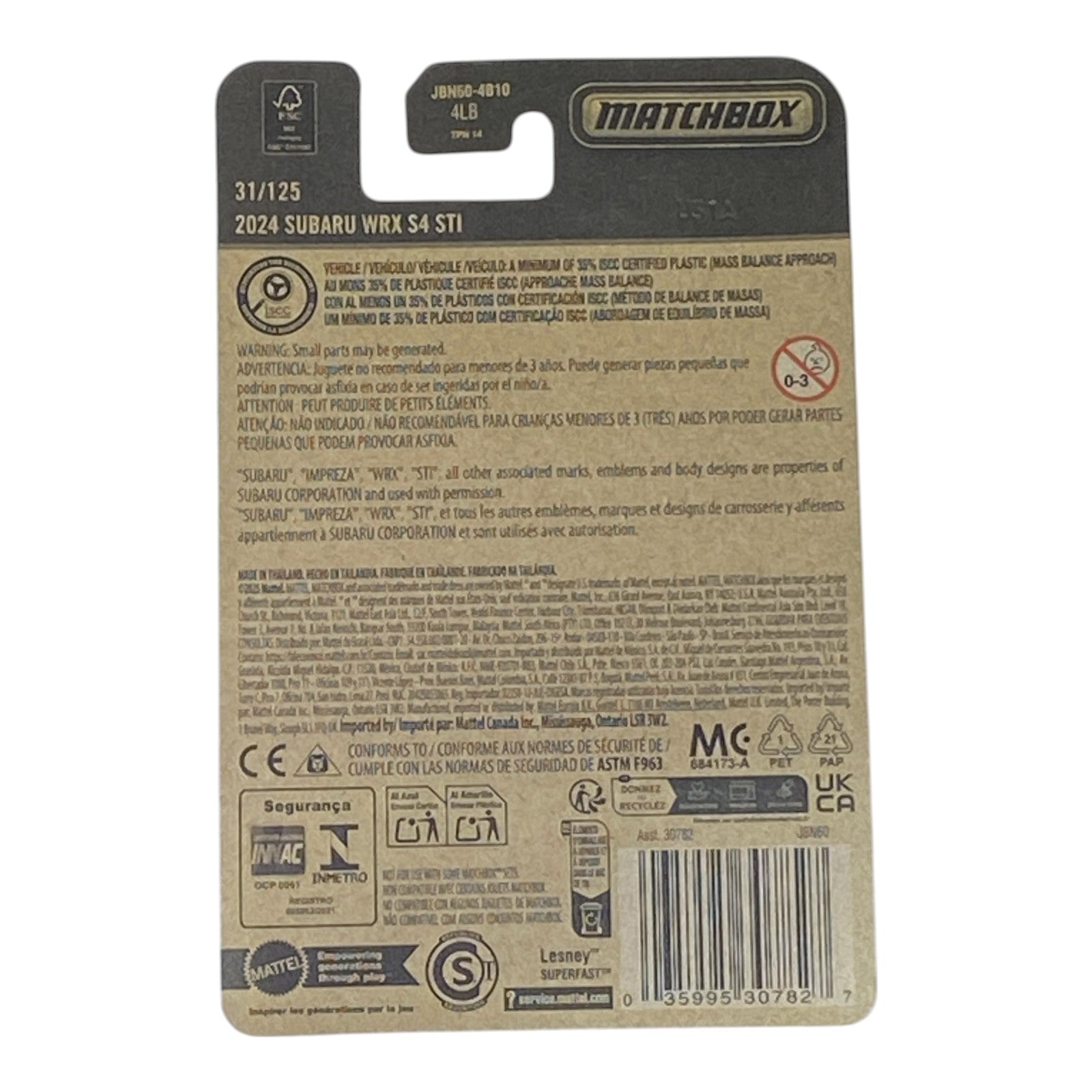 Discover the blue 2025 Matchbox 2024 Subaru WRX S4 STi (#31/125) – a dynamic 1:64 scale diecast replica of the high-performance Japanese sports sedan, finished in stunning sapphire blue metallic.