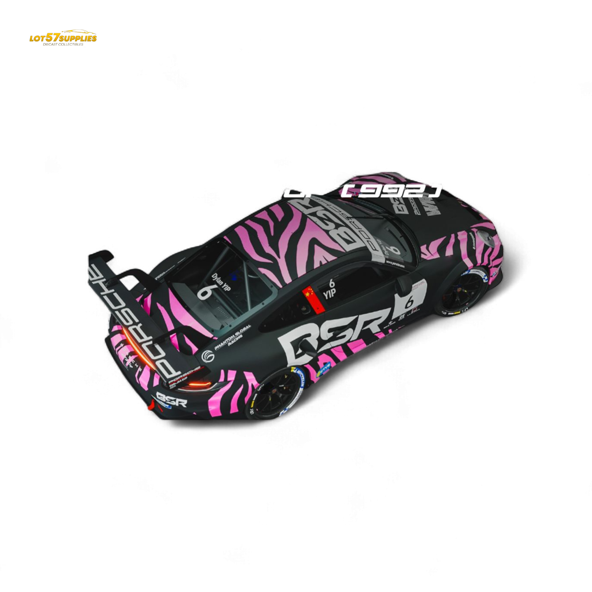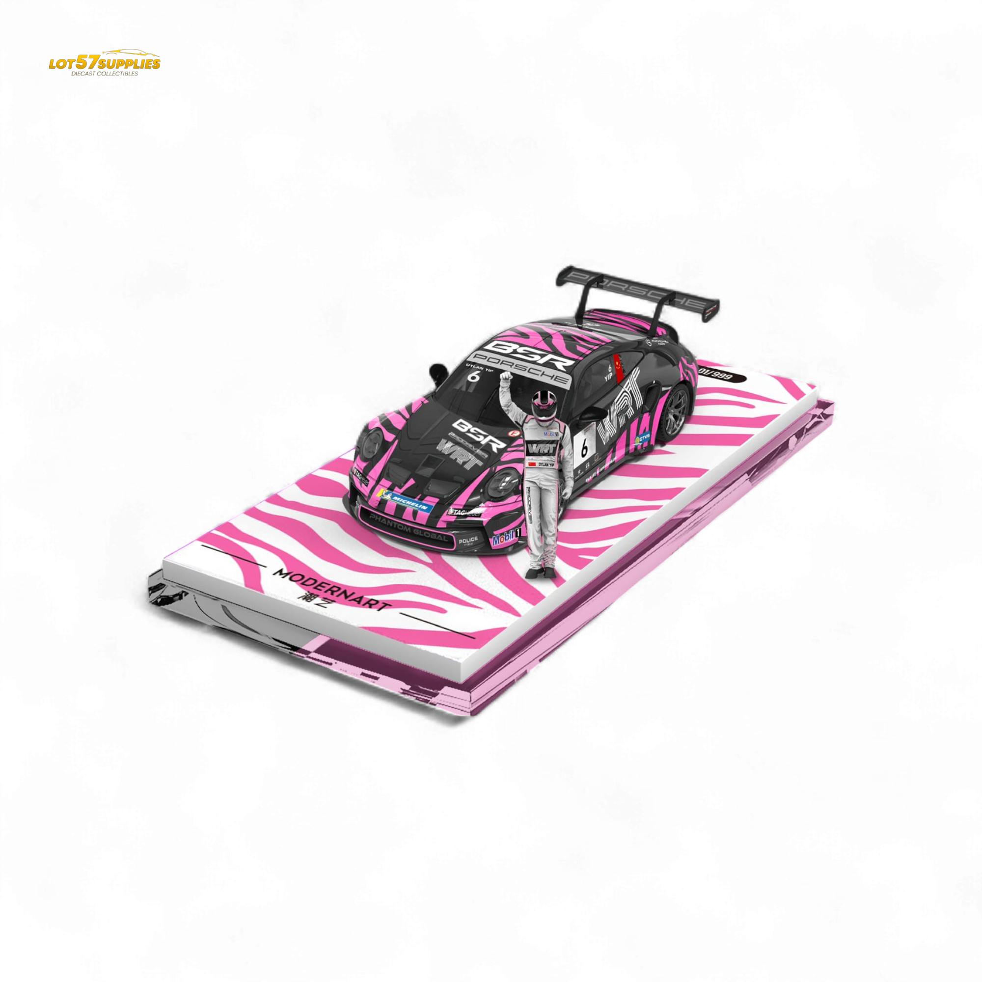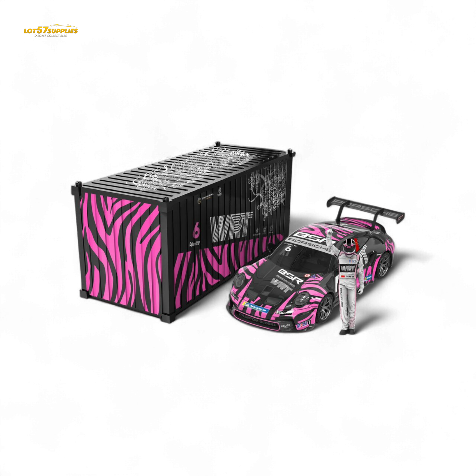 Step into the fast lane with the Carrera Cup Zebra Edition Set, featuring a high-detail Porsche GT3 race car wrapped in bold pink-and-black zebra livery. This 1:64 scale stunner comes with a matching custom container and a fully suited driver figure — ready to steal the show on your shelf.