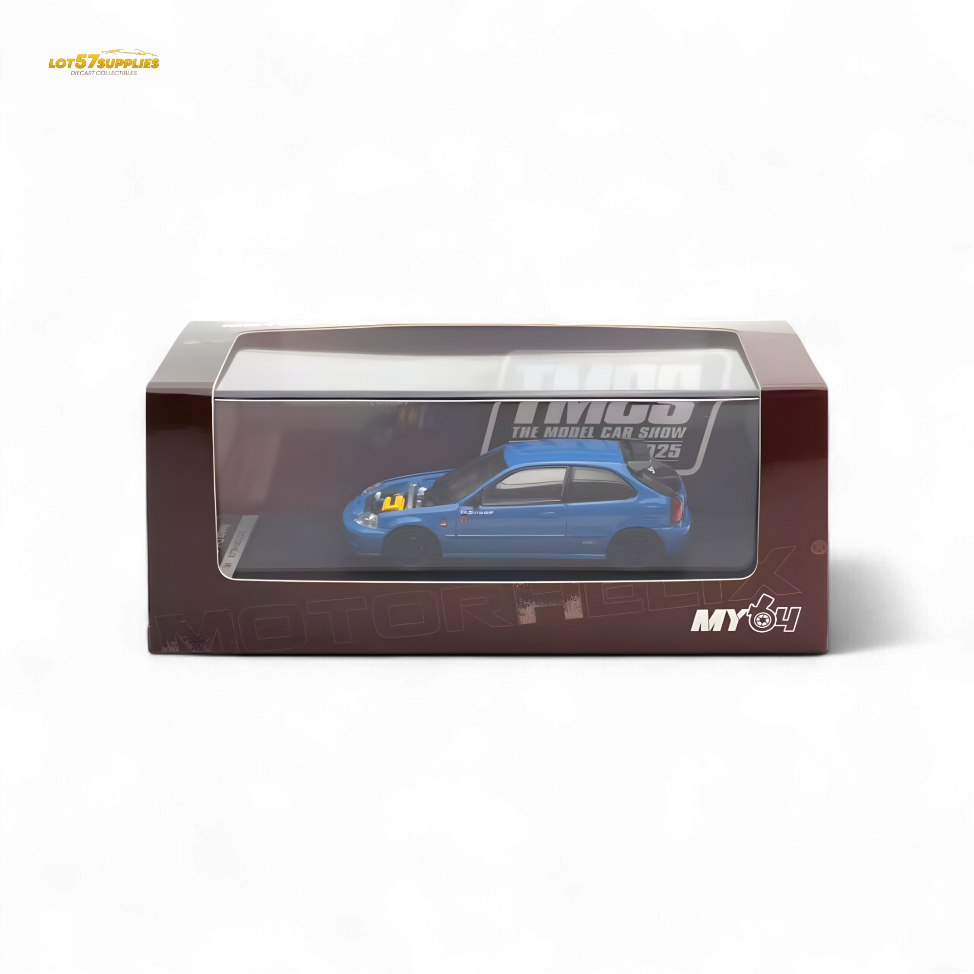 MOTORHELIX delivers a clean and aggressive take on the iconic Honda Civic Type R EK9. This 1:64 scale model comes in the signature Spoon Blue with a carbon-look hood, black 5-spoke wheels, and Spoon Sports decals. Detailed headlights, molded mirrors, and a large rear spoiler round out the race-ready aesthetic. A JDM classic reborn in premium diecast.