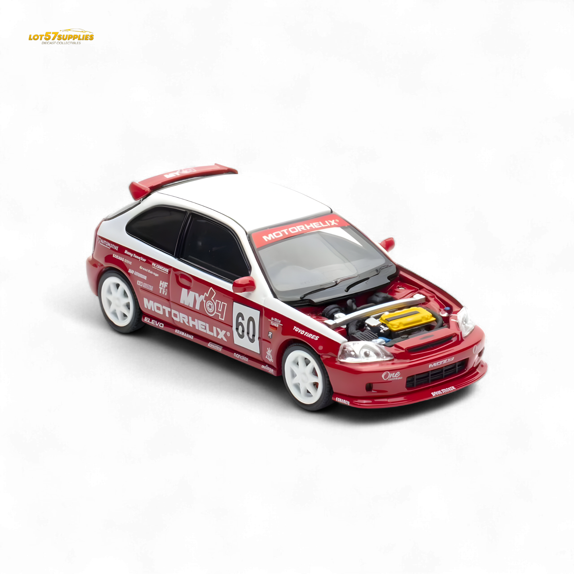 Get track-ready with this MY64 race-liveried Honda Civic Type R EK9 from Motorhelix. Decked out in red and white with aggressive sponsor branding, this 1:64 diecast captures a full-on competition vibe. Featuring white race wheels, aerodynamic detailing, and a boxed collector case, it’s a perfect blend of retro JDM attitude and race-bred styling.