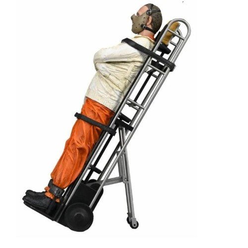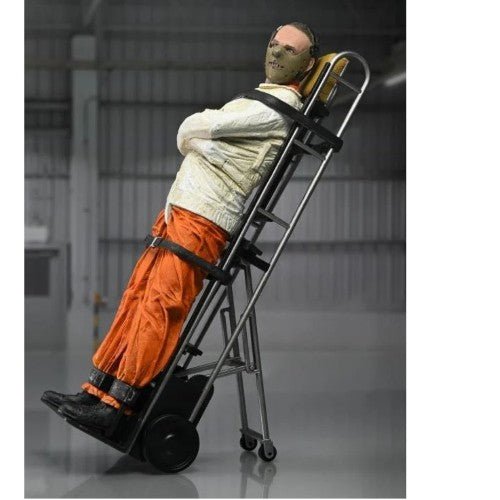 From NECA. Add the iconic Hannibal Lecter to your horror collection! Portrayed by Oscar winner Anthony Hopkins, the brilliant and psychotic doctor fromThe Silence of the Lambsstands in his orange prison uniform and straight jacket. This chilling 7" scale figure by NECA is articulated for posing and comes with interchangeable heads, his trademark mask, and a dolly accessory for transporting him.