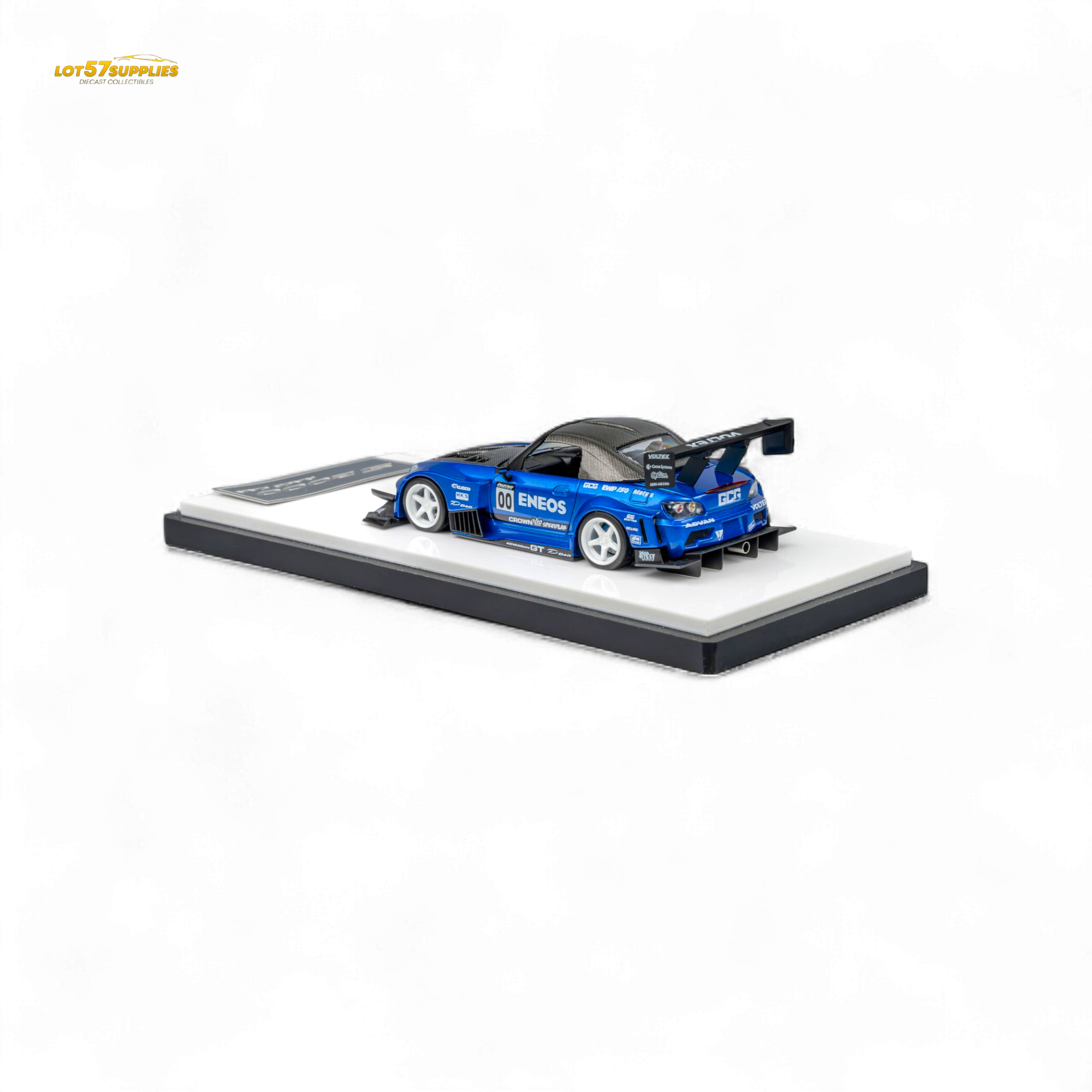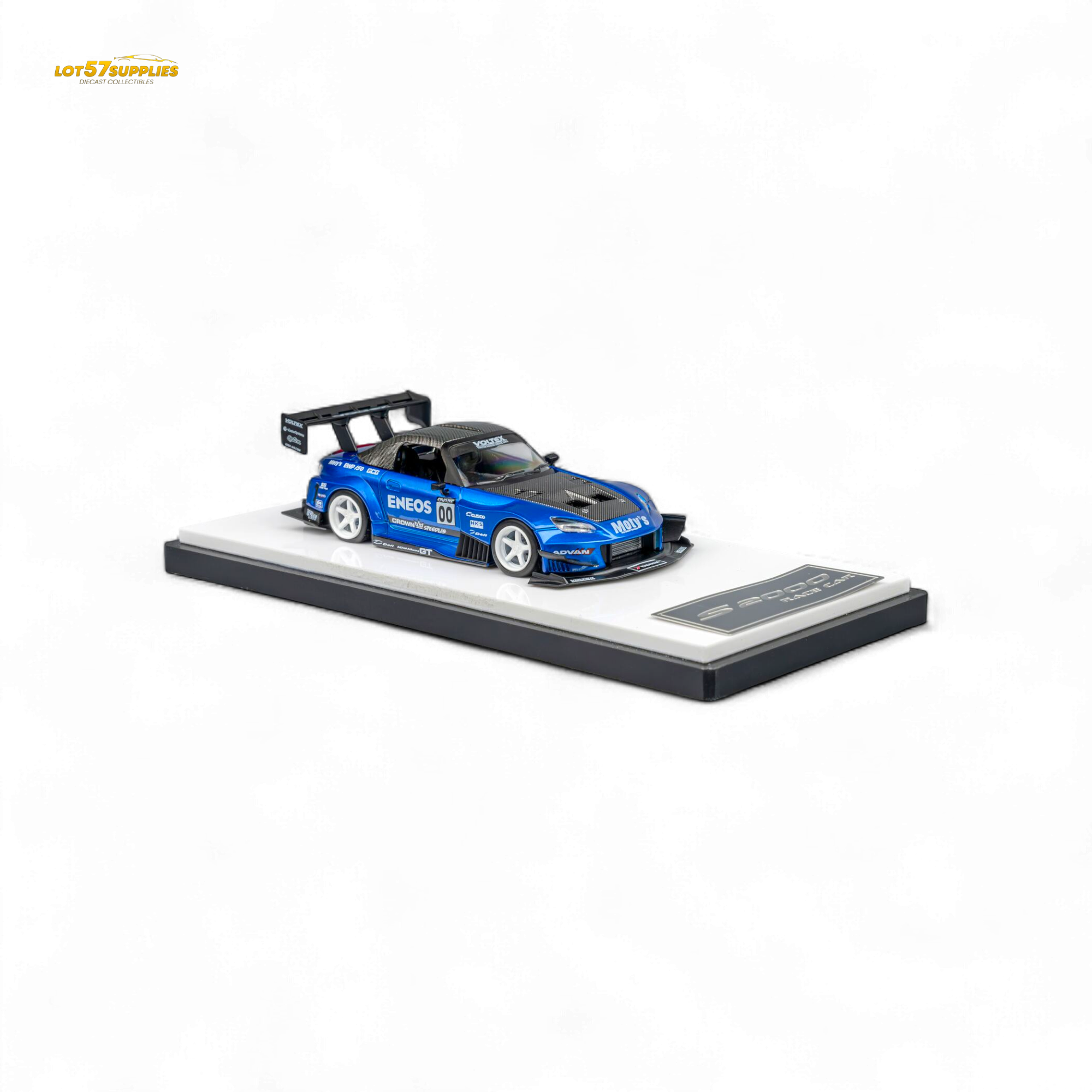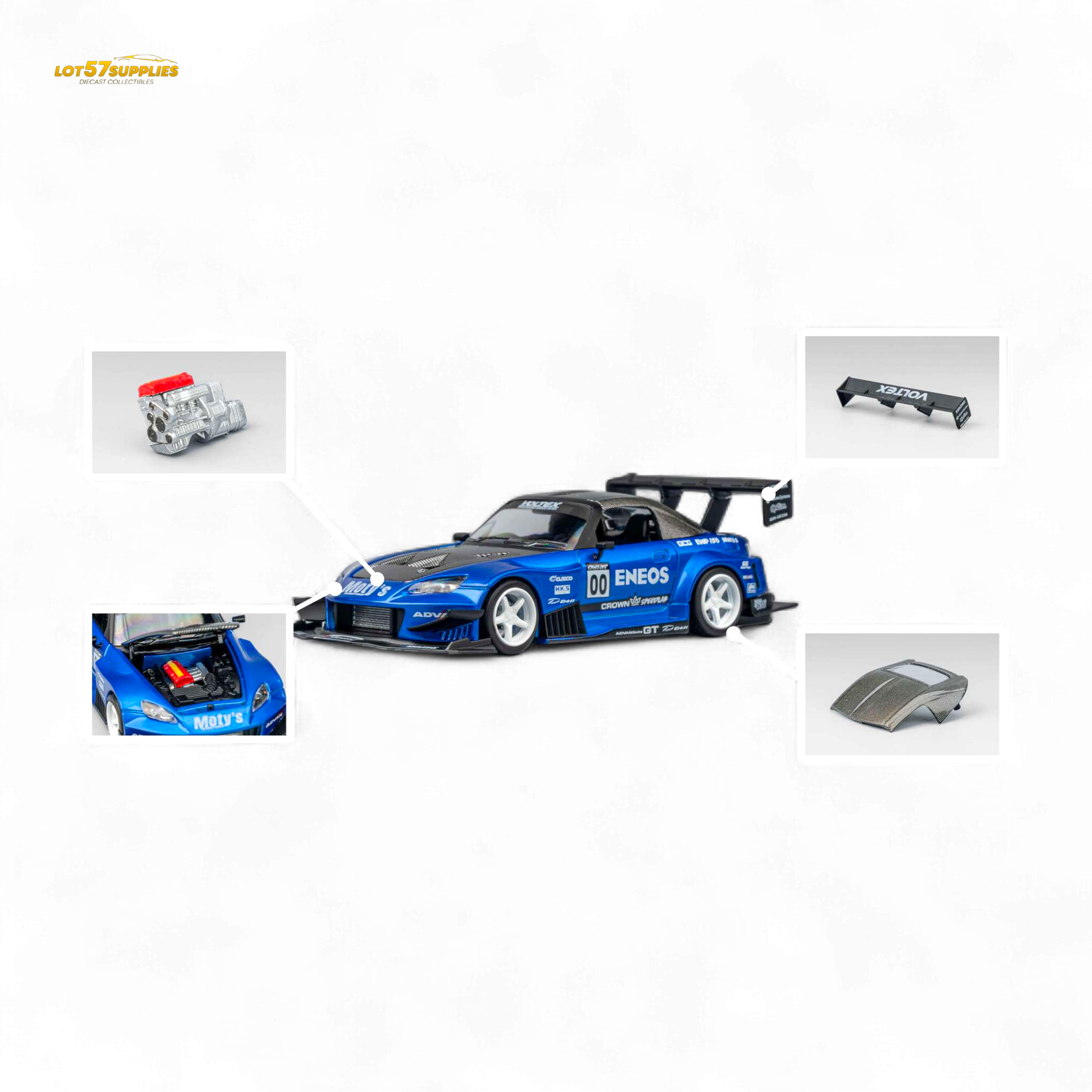 Features: Carbon fiber racing kit & race livery, magnetic interchangeable spoiler, opening/removable hood, detachable exhaust, detailed interior